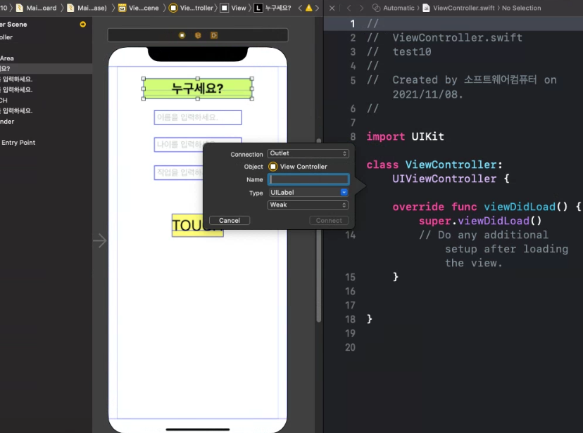 스토리보드에서 객체를 Ctrl 키 누른채 드래그해서 ViewController.swift 코드에 갖다두면 outlet 변수 추가 가능! (Interface Builder)