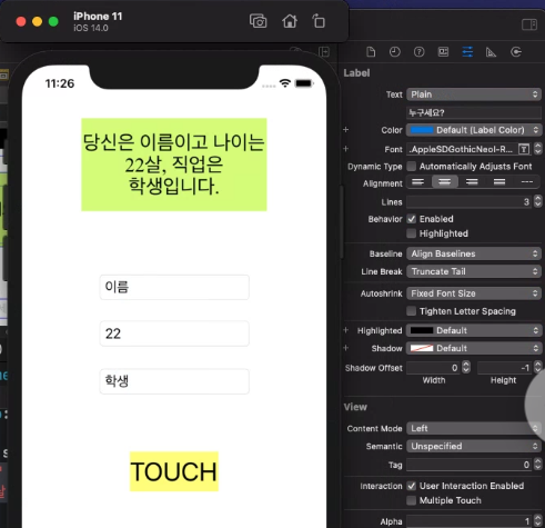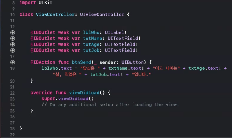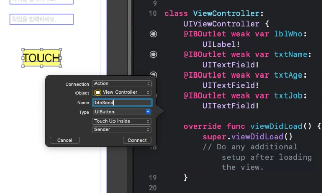 레이블과 텍스트필드는 각각 프로퍼티 생성하고, Action 버튼으로 만든 btnSend는 함수 생성