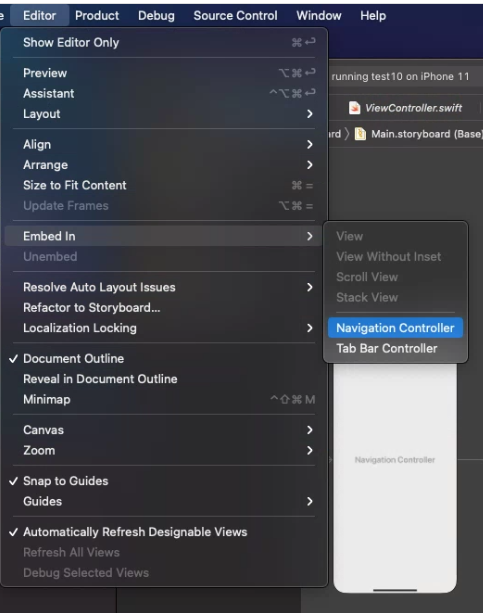viewController 선택 후 Editor - Embed In - Navigation Controller