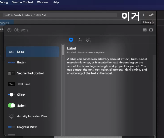스토리보드 선택하고 상단 바에 있는 + 선택시 object추가 가능